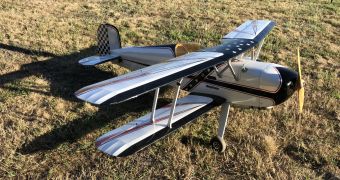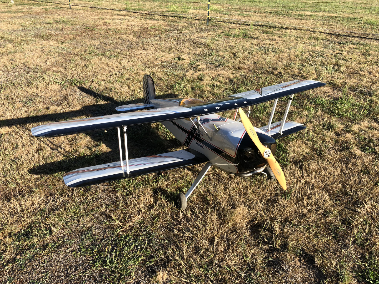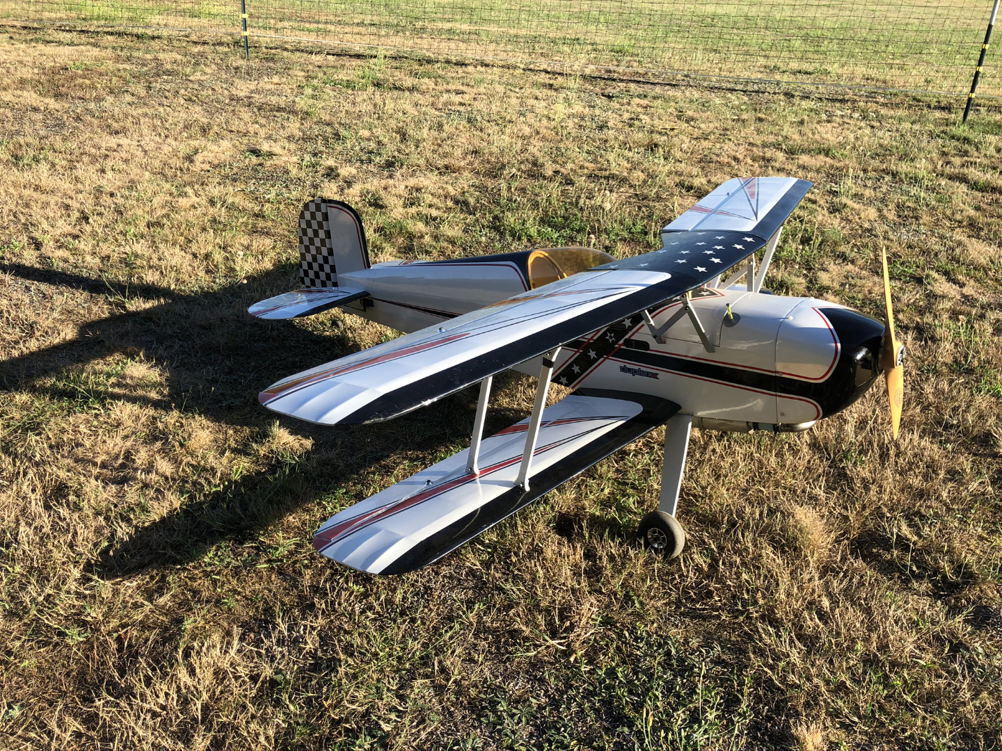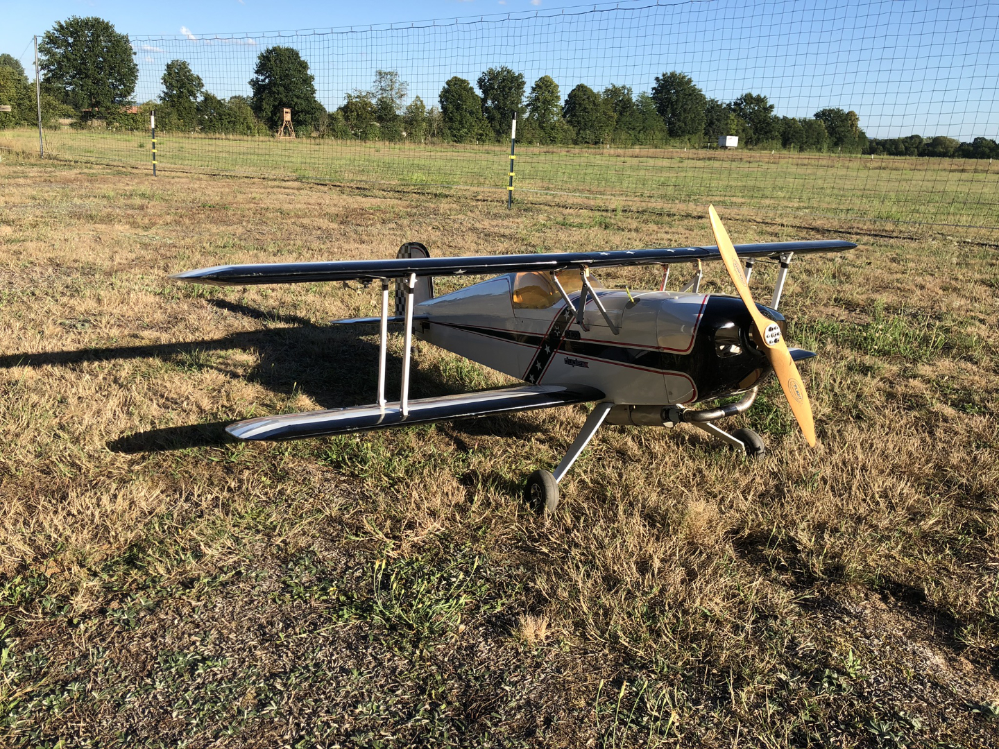 Die Bücker Jungmeister von David Kreipner kommt mit weiten 2,00m Spannweite daher. Angetrieben wird sie von einem 3W60 2-Takt-Benzinmotor mit dementsprechend 60ccm und ca. 5,5PS. Der Doppeldecker hat ein Abfluggewicht von ca. 10kg was ihn zu einem der Schwergewichte an unserem Platz macht. Ein wunderschönes Flugbild und der klasse Sound runden das Gesamtpaket ab.