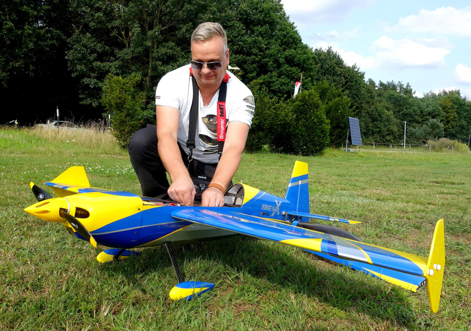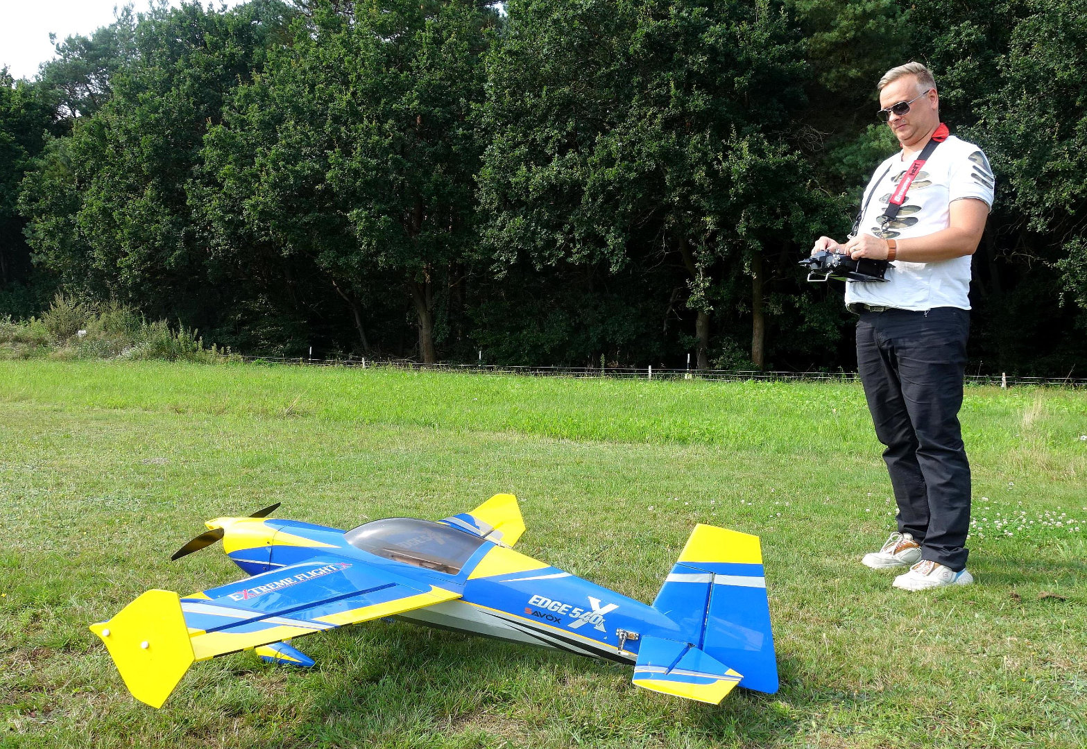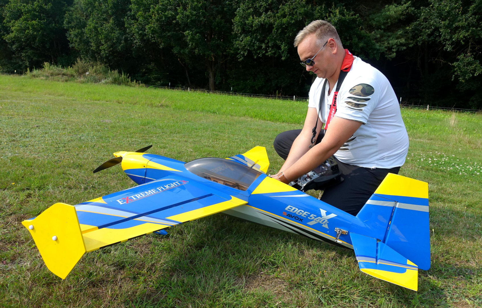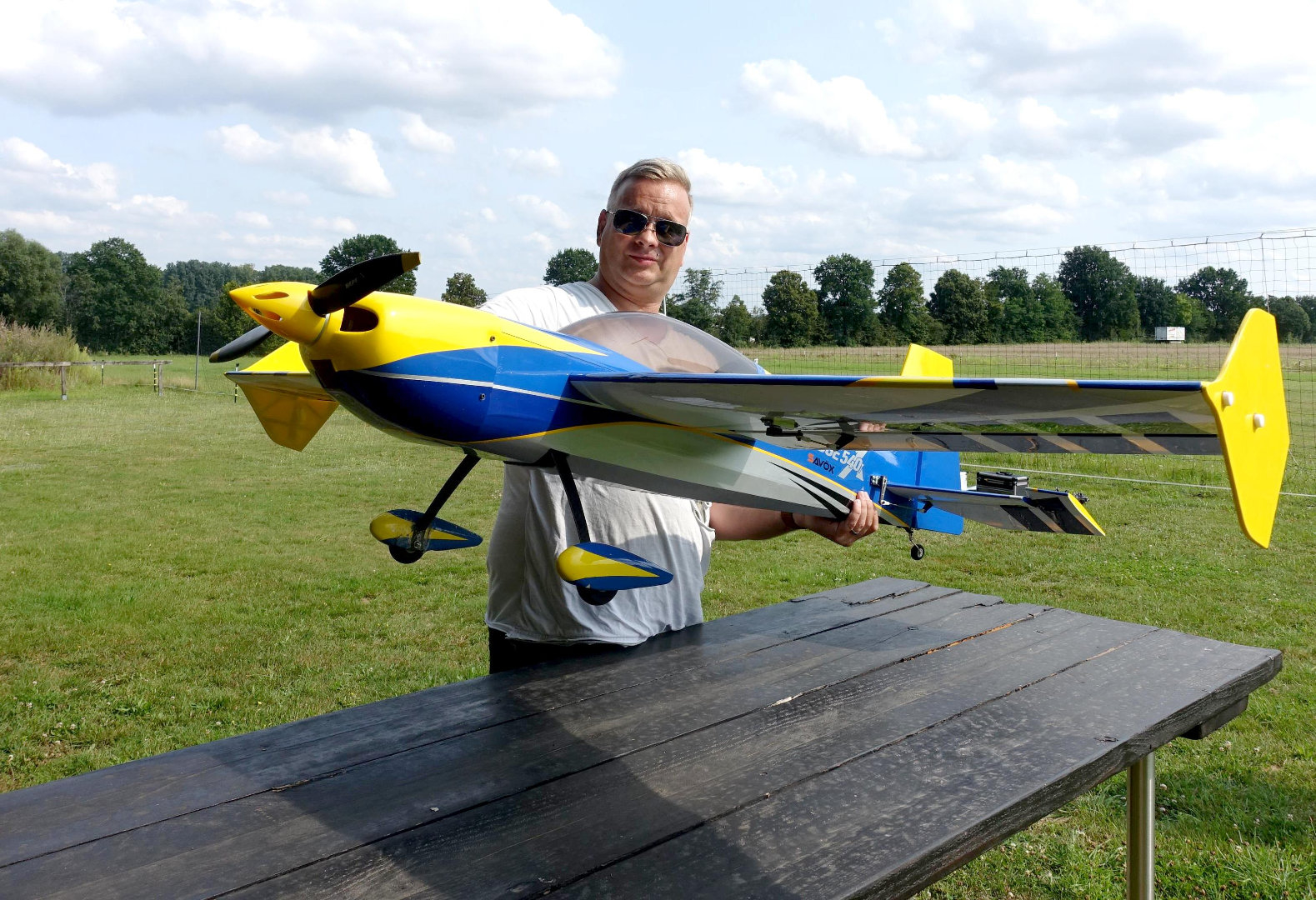 Bei diesem Modell handelt es sich um eine Edge 540 V2 in der 60" Größe (ca. 1,50m Spannweite). Das Flugzeug ist ein klassischer 3D-Kunstflieger der Marke Extrem Flight. Befeuert wird das Modell wir durch einen 6S Lipo-Akku und einem Torque 4016/500 MKII Outrunner Motor. Zur Regelung des Stroms ist ein Graupner Brushless Control + T100 BEC verbaut. Die Ruder werden von 4 Savöx Midi HV Servos angesteuert.