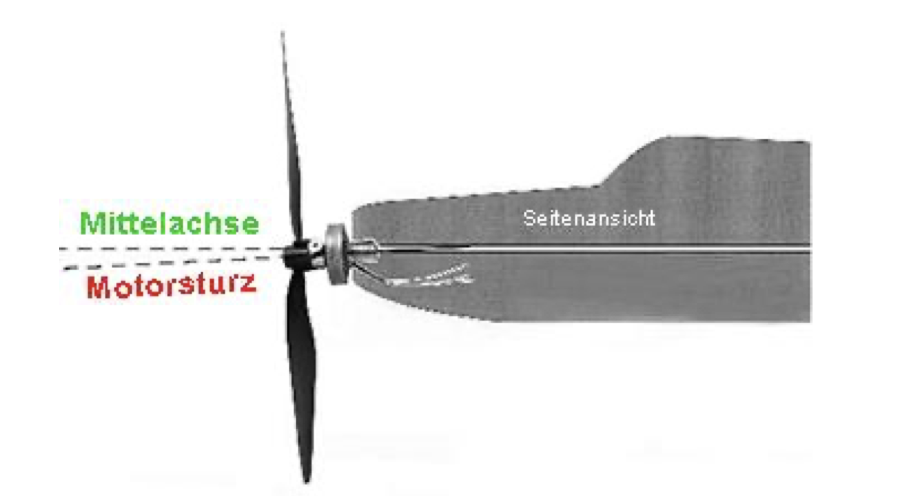 Der Motorsturz hat maßgeblichen Einfluss auf die horizontale Flugbahn des Modells. Der Motorsturz, d.h. die Neigung des Motors nach unten, wirkt einem ungewollten Steigen des Modells bei Vollgas entgegen. Bei voller Motorleistung und dadurch relativ hoher Fluggeschwindigkeit sowie einer hohen Einstellwinkeldifferenz (EWD) entsteht ein großer Auftrieb, der mit dem Motorsturz kompensiert werden muss. Der erforderliche Motorsturz wird beeinflusst durch die Größe des Motors, der verwendeten Luftschraube, dem Tragflächenprofil und der EWD. Bei meinem Zirkonia musste ich beim Umstieg von einer 15 x 11 Vierblatt auf eine 16 x 12 Zweiblatt den Motorsturz um fast 1 Grad verändern.