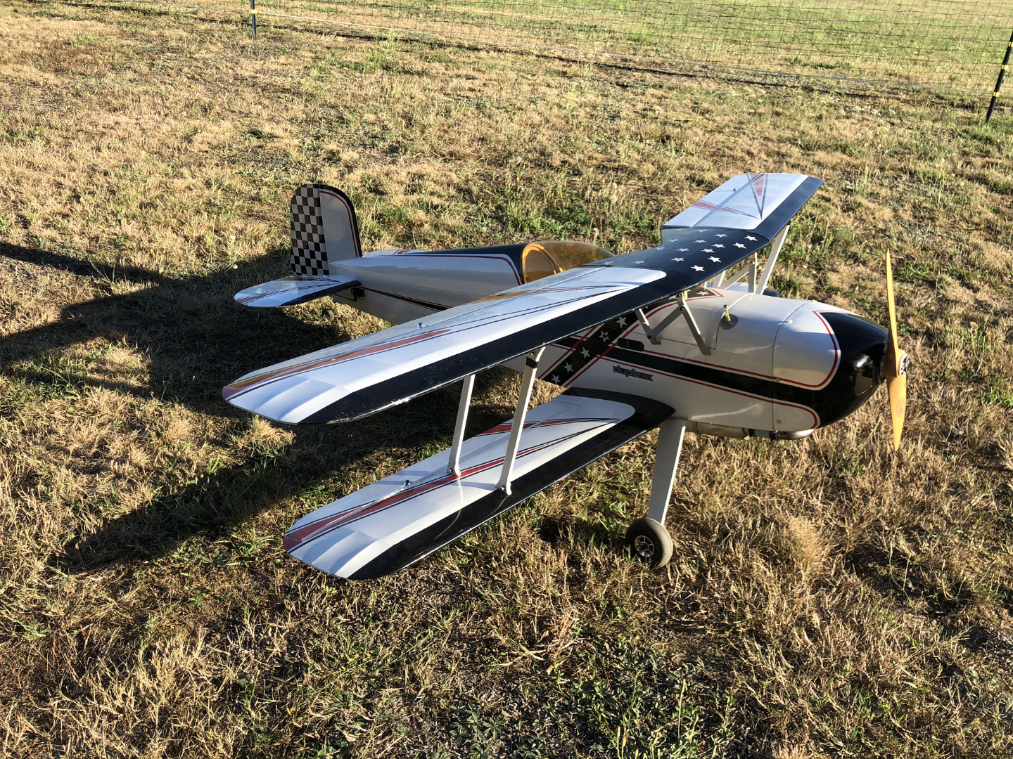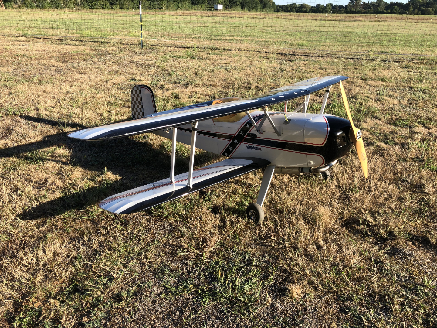 Die Bücker Jungmeister von David Kreipner kommt mit weiten 2,00m Spannweite daher. Angetrieben wird sie von einem 3W60 2-Takt-Benzinmotor mit dementsprechend 60ccm und ca. 5,5PS. Der Doppeldecker hat ein Abfluggewicht von ca. 10kg was ihn zu einem der Schwergewichte an unserem Platz macht. Ein wunderschönes Flugbild und der klasse Sound runden das Gesamtpaket ab.